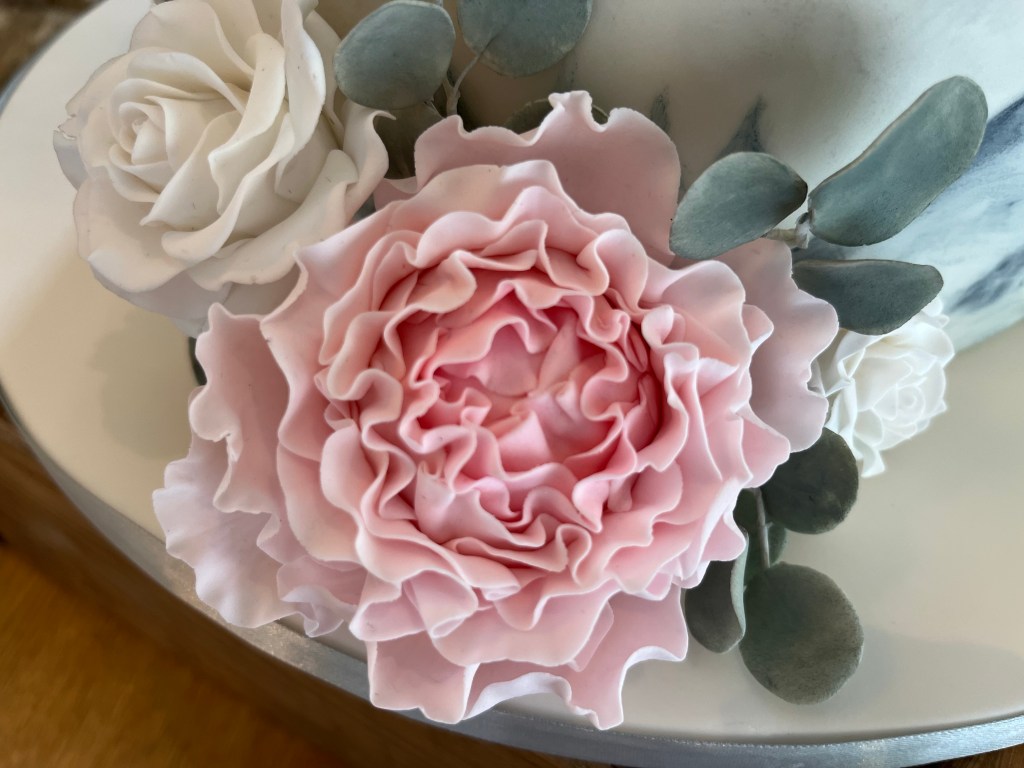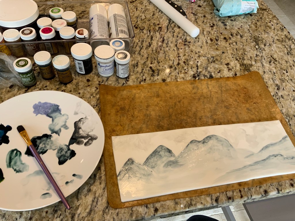 I’d never painted on a cake before, so I watched lots of YouTube videos and did some research to enable me to get the finish I wanted. In the end the best option was to use watered down food colouring in various blue, green, grey and black tones. I had a lot of fun practicing and experimenting on rolled out sugar paste.
