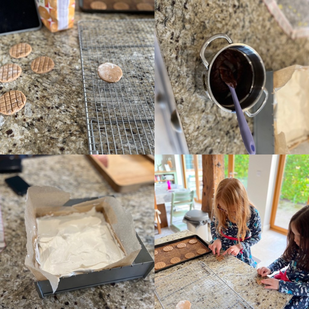 Paul’s recipe can be found here. We ended up with about twice as many biscuits, but homemade biscuits don’t last long in our house, so always happy to have extra. We didn’t have the right pattern stamp for the biscuits, so I used a cooling rack to make a similar pattern on top.