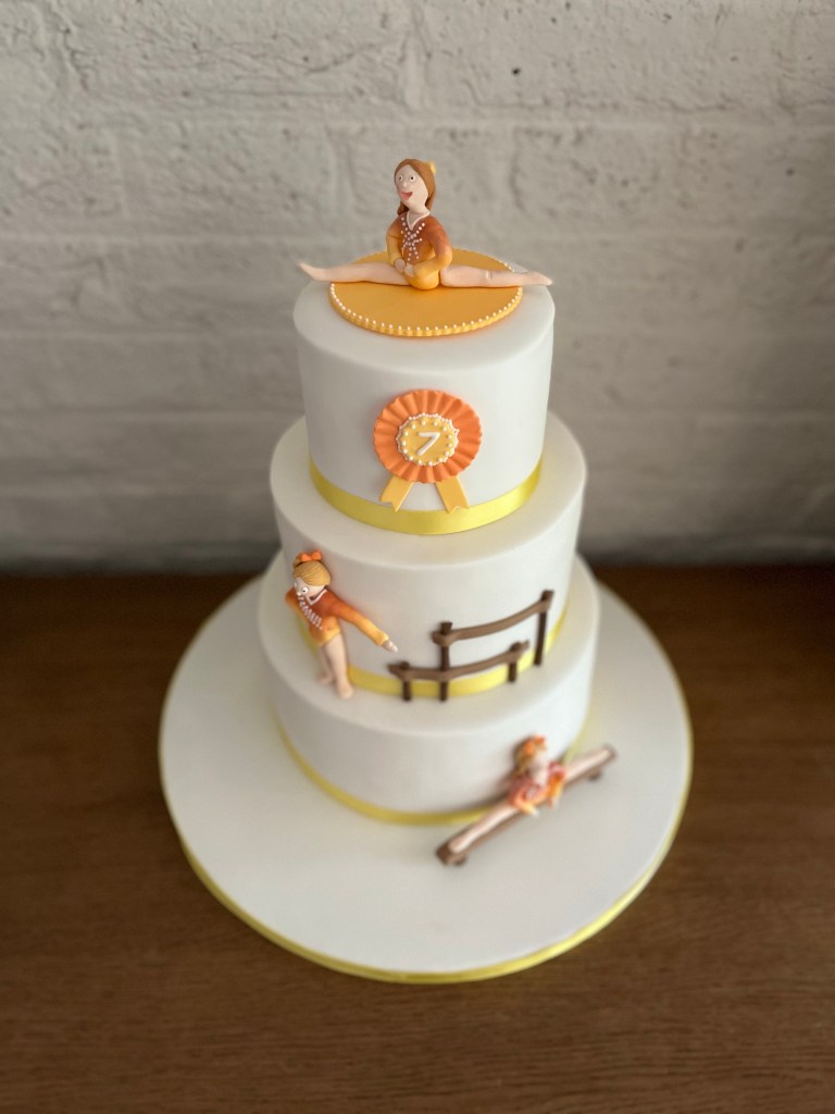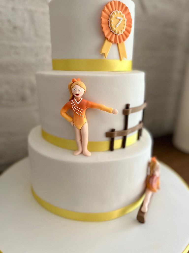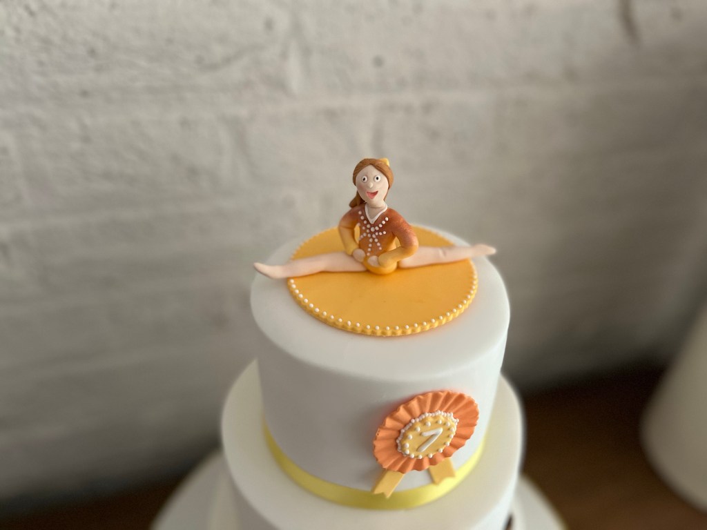 I made the leotards in yellow and used an orange petal dust to create the ombré effect. I had some peach shimmer dust which worked perfectly to give the girls shimmery leotards too. I piped the dots on the leotards with royal icing and a few finishing touches on the rosette and floor mat too. The girls absolutely loved their cake, especially seeing themselves created out of icing! Happy 7th Birthday!