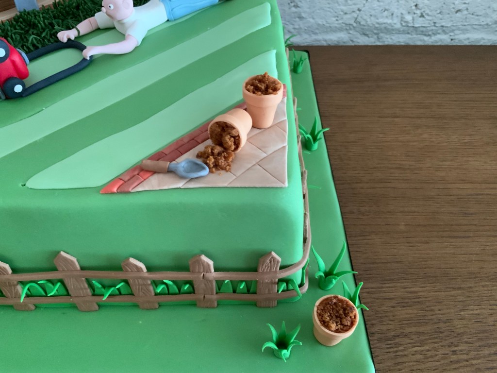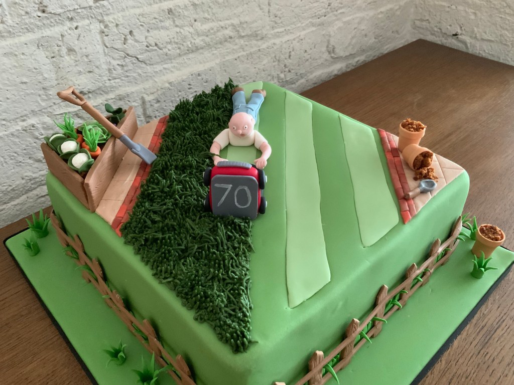 I took ideas from various lawn mowing cakes that I had seen and added a few personal touches too. I liked the idea of painting a number 70 on the bottom of the lawn mower. And also using terracotta coloured bricks to go around the lawn just like in Mum and Dad’s garden.