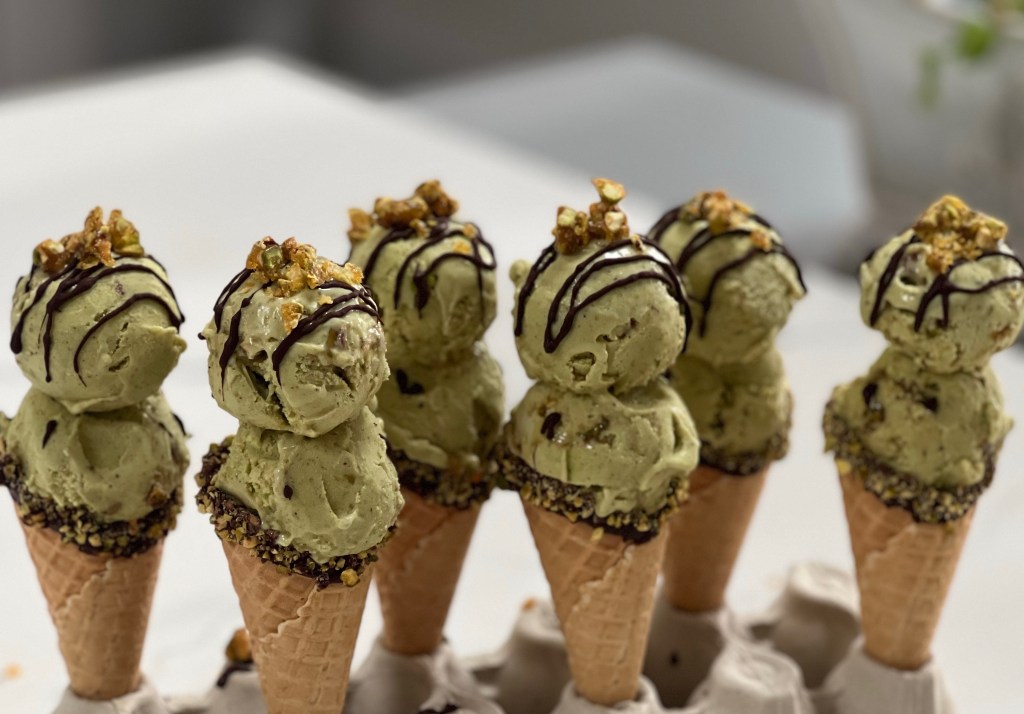 I couldn’t get hold or Iranian pistachios so just used normal ones. And I didn’t own a waffle cone maker and when I went online to buy one they had sold out everywhere! So I reluctantly bought waffle cones from the supermarket. I have since managed to get a waffle cone maker and can’t wait to have a go at making my own cones for next time. We were going to my parents for lunch on Sunday for roast beef, so I offered to bring the ice cream as pudding. Everyone loved it, even Mum – she’s not normally an ice cream fan especially in autumn/winter as it makes her too cold, but it was nearly 20 degrees on Sunday and the ice cream was too good to miss!