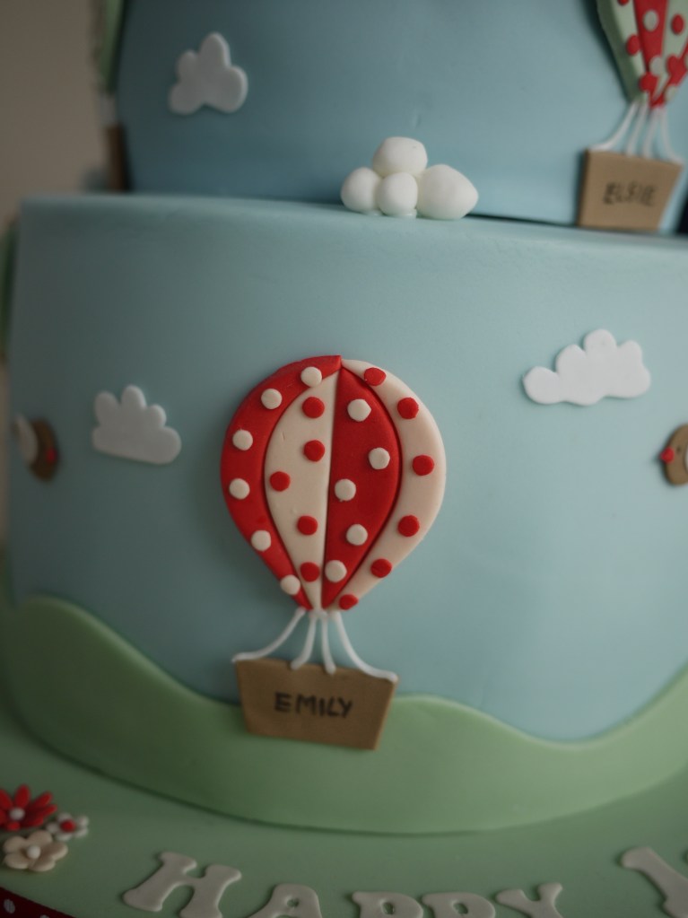 I personalised the cake by making a hot air balloon for each child with their name on the basket. I made little birds and flowers to fit with the colour theme. I think I also cut the clouds by hand which I remember taking a while. The spotty ribbon around the board really finishes the cake off. A super cute first Birthday cake!