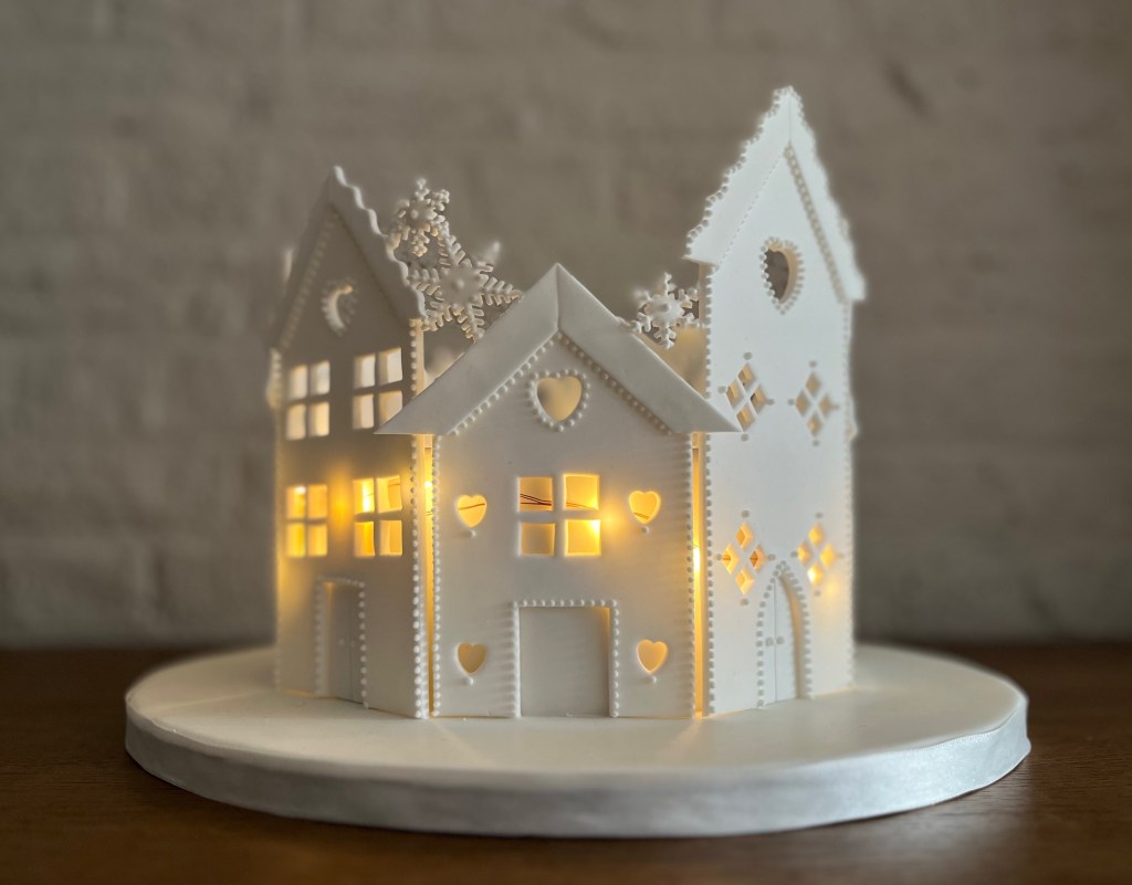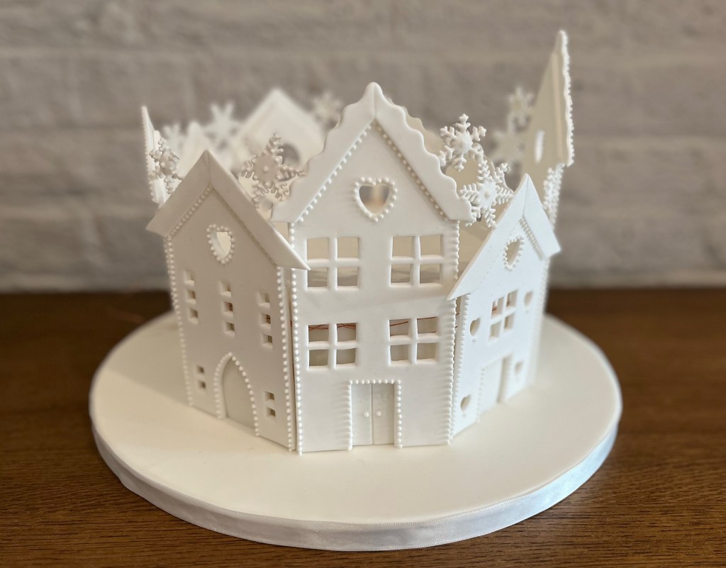 Next I cut out each house, rolled out some sugar florist paste and cut the houses out one by one, I used a square plunge cutter to make the square windows and heart and circle cutters for some of the other windows. The doors were cut with a sharp knife. I then cut strips for the roofs and glued them in place with edible glue. I then had fun and games trying to add the LED lights, I should have wound them around and secured them in place before I put the houses on and hidden the copper wire a bit better, so it wasn’t quite as neat as I had hoped, but they still look really cool when they are turned on.