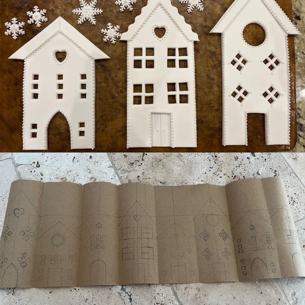 I started by measuring roughly how big the circumference of the cake would be once it had the marzipan and icing on. I then measure this on some brown paper and divided it up into 8 equal houses. I then designed each house.