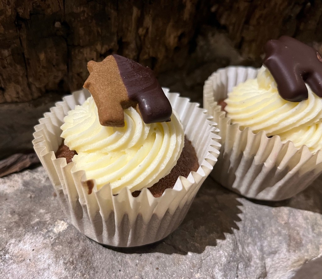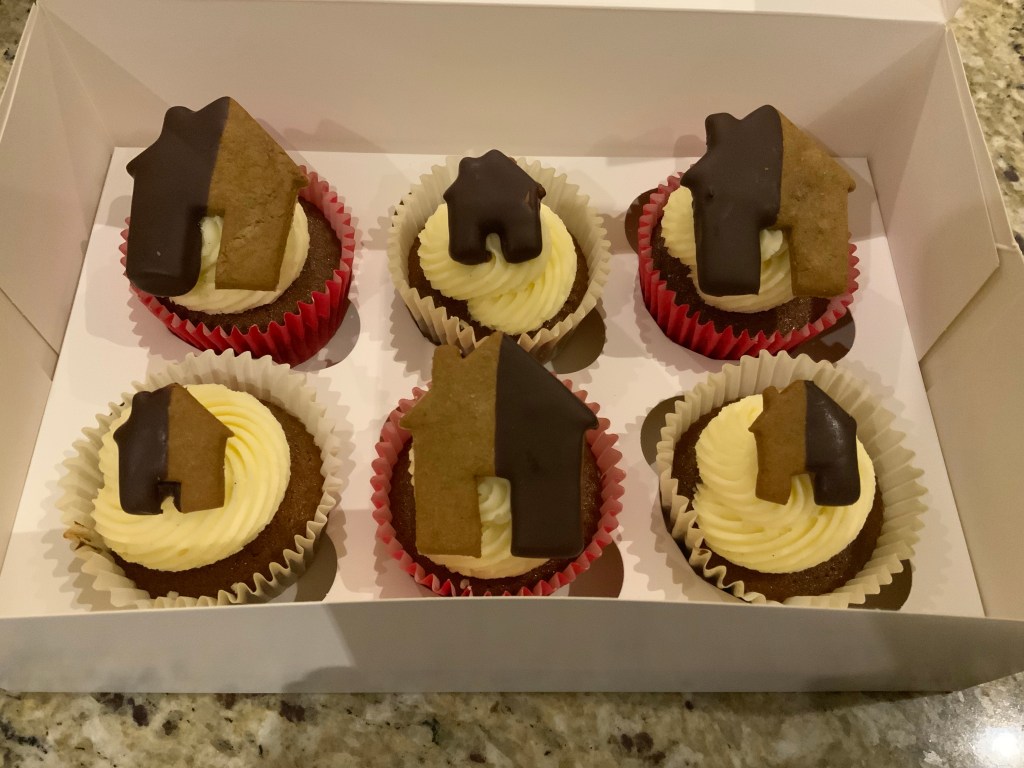 Pipe onto the cupcakes and top with your choice of decorations. I made some mini gingerbread houses and dipped them in dark chocolate.