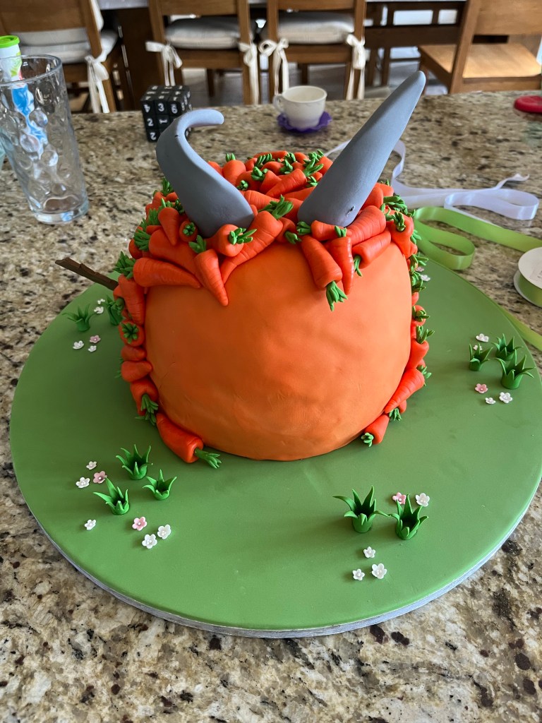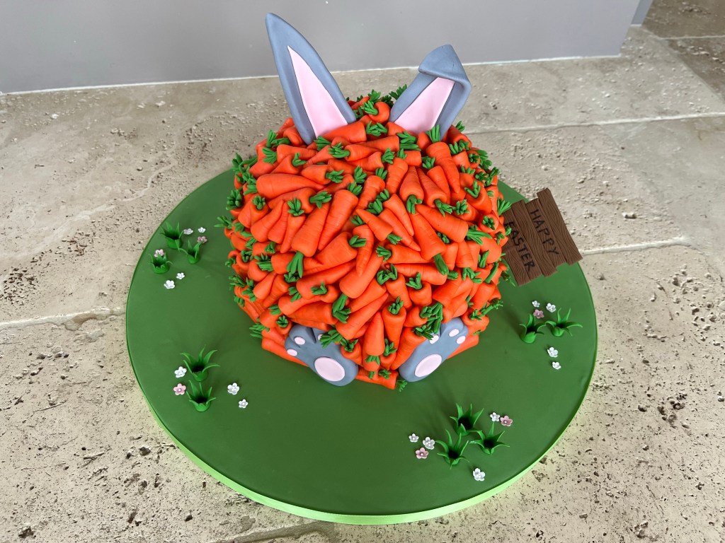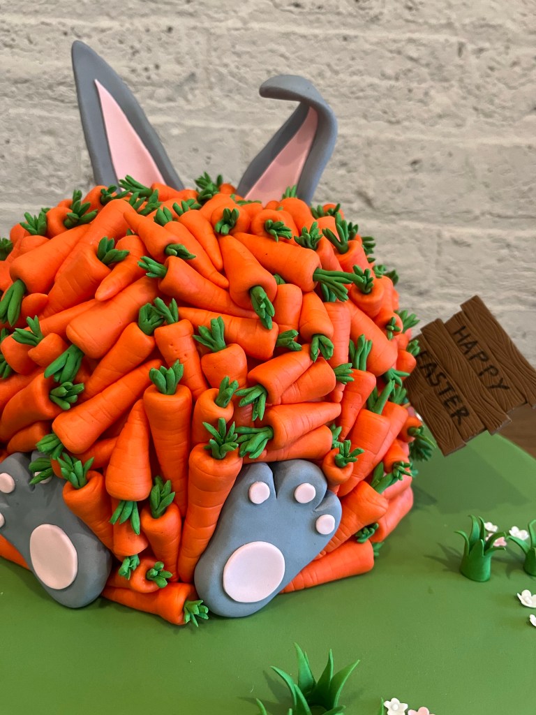 The decorations took a lot longer than planned due to the amount of carrots I had to make! I covered the cake with orange sugar paste first so any gaps in between the carrots would be orange. I made the Happy Easter sign, grass, flowers, bunny ears and feet in advance and had inserted thick florist wires into the ears so I could push them into the cake without them falling over.