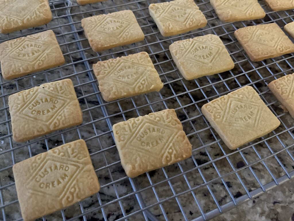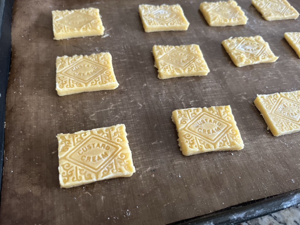I had to keep putting it back in the freezer once I had rolled it out as it was too squishy to cut, so it took ages to cut them all out. But I eventually managed it and although the imprint wasn’t great, you could still tell what they were supposed to be. The custard cream filling was amazing! It was great to take them to the rugby festival and share them, they definitely got the thumbs up!