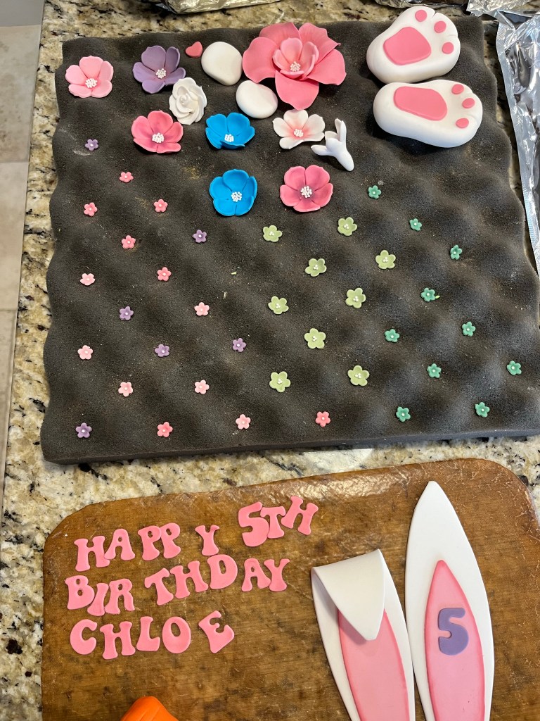 It was Chloe’s 5th Birthday at the end of November and once again she was very specific about the cake she wanted! She chose a bunny design with pink, blue and purple flowers and requested the bake off chocolate fudge cake with some salted caramel between each layer – good choice Chloe! Click here to see some more pics of this cake.