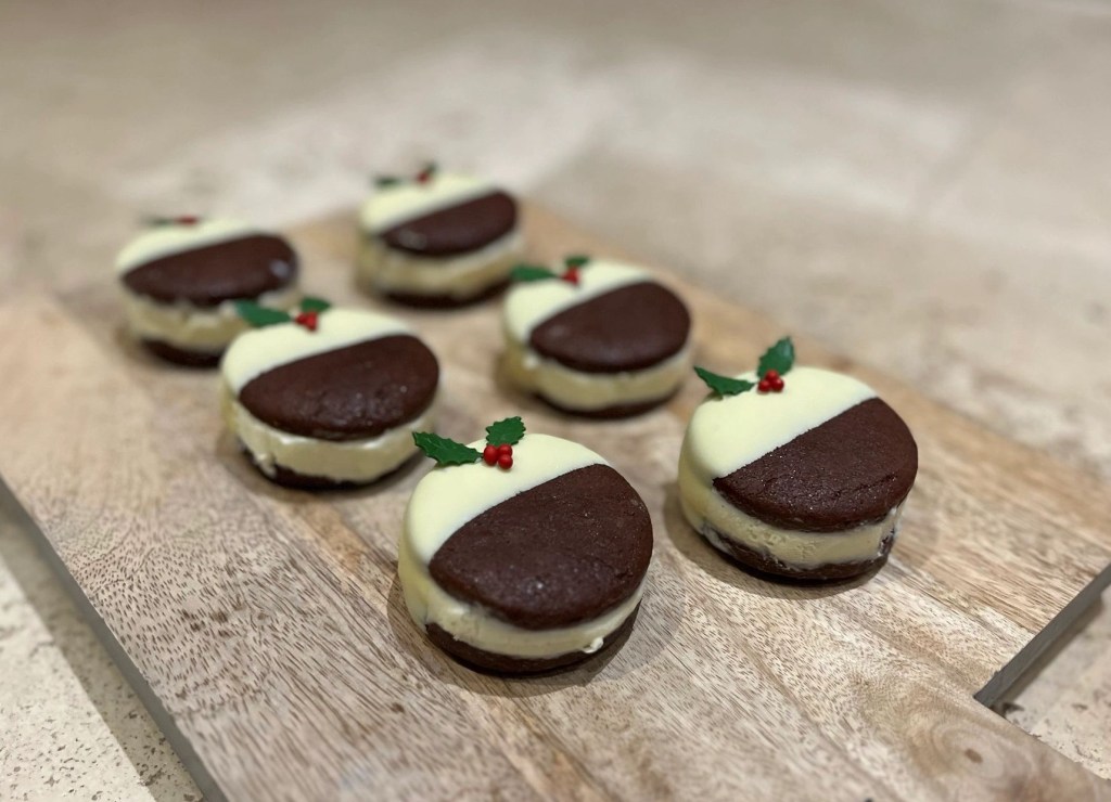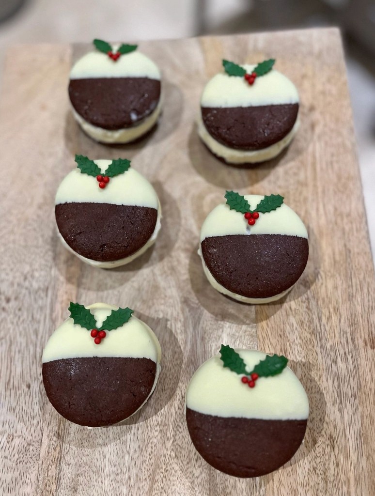 I love combining recipes or using them in a slightly different way, so when I saw the cover recipe on November’s Sainsbury’s Magazine for chocolate lebkuchen I thought they would be perfect to turn into ice cream sandwiches and decorate them as Christmas puddings! Click here to see the recipe.