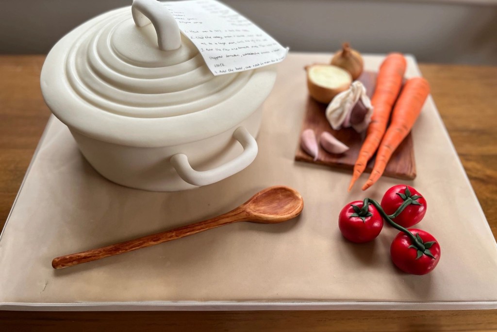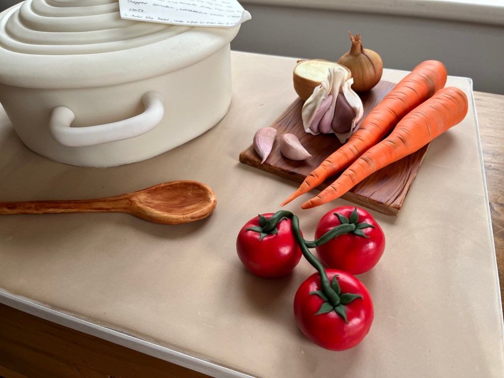 The wooden chopping board and spoon were brushed with some watered down food colouring to give a more realistic wood effect. I inserted some wire into the ends of the handles and let it dry before I secured them in place using edible glue. The cake was a fruit cake covered with marzipan and then iced with white icing to look like a stew pot.