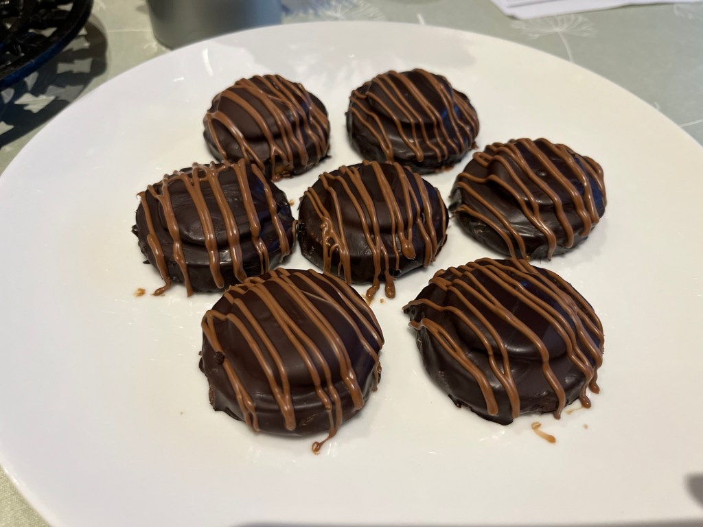 The biscuits baked really nicely and held their shape well. The peppermint creams warmed up very quickly once they were out of the freezer and were very sticky to handle. But the messiest part was coating them in chocolate! We didn’t manage to temper the chocolate unfortunately as it was such a rush, but despite being a bit of a mess they were absolutely delicious!