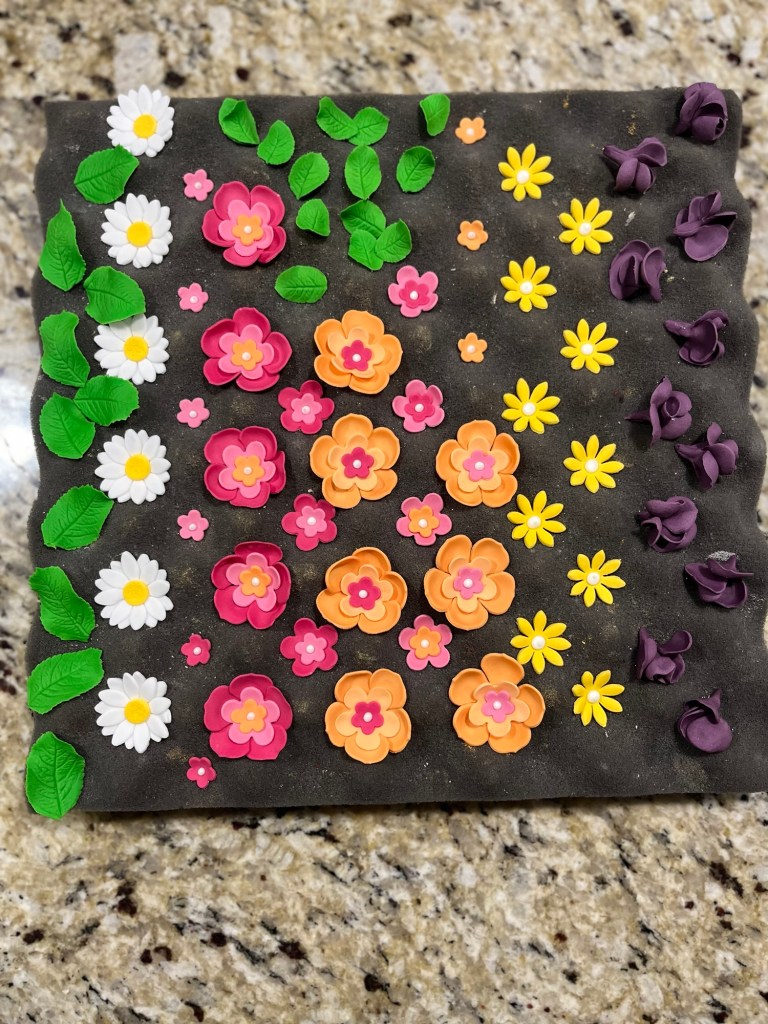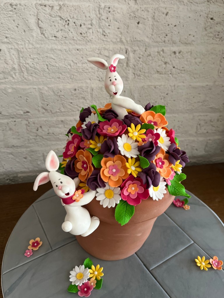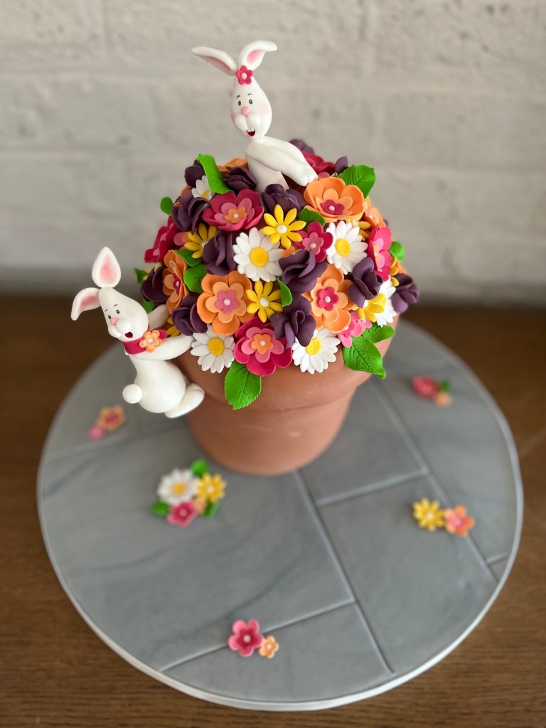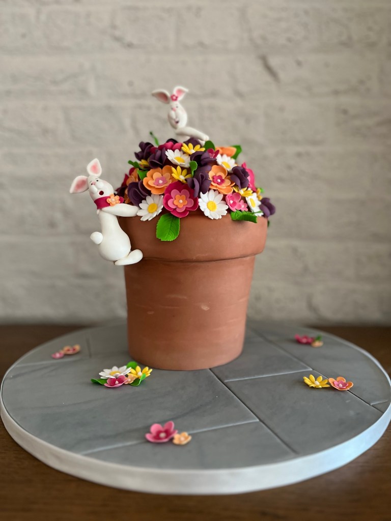 Once I had stacked the cake I trimmed it to make a flower pot shape and then covered it with the marzipan, the off cuts were delicious! I then covered the cake with the terracotta coloured fondant and added some texture to make it look like a flower pot. I made the dome for the flowers to go on with some cheap fondant from the supermarket and secured the bunnies in place before covering it with all the flowers I had made in advance. Finally I added the leaves in the gaps and left over flowers onto the cake board that I had covered with grey marbled fondant to look like patio slabs.