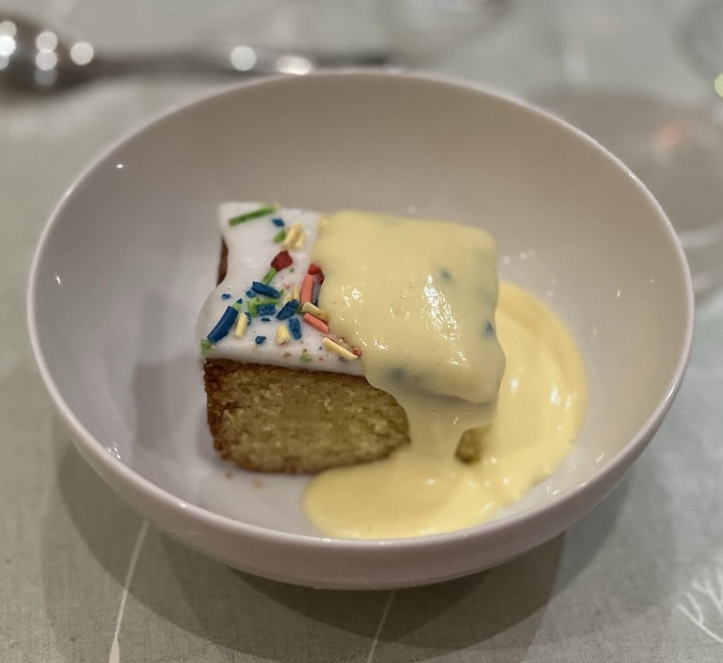 Once the icing had baked and cooled down the girls crumbled them up to make the sprinkles which we used to decorate the cake. They were a bit of fun to try out, but I don’t think we’ll be making them again! The cake was absolutely delicious with the warm custard, it definitely reminded us of school puddings, but a lot tastier!