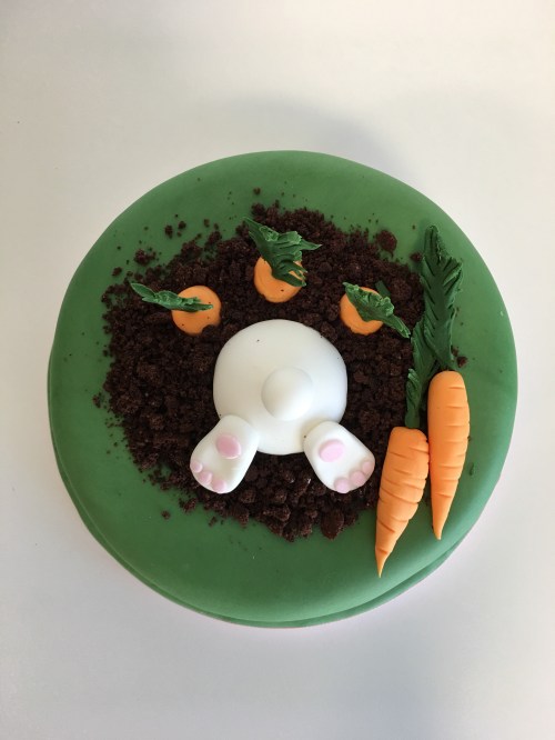 Being at work all week meant I only had a couple of evenings to make and decorate it so I picked something fairly simple. The cake was a chocolate caramel ombré cake and I crumbled up the off cuts of the chocolate cake to make the soil. I covered the whole cake in green sugarpaste, cut out a circle from the middle and then filled it with the ‘soil’. The bunny was made from a ball of white icing flattened slightly and then put in the soil. I then stuck on a small ball of icing for his tail and made 2 feet which I finished off with a few small circles of pale pink icing. The carrots were made from orange icing and I marked some lines on them with the back of a knife. I added cake wire to the middle of the green carrot tops to keep them standing upright. Annoyingly they were slightly too tall to fit in the box so I had to break the tops off to make them a bit shorter!